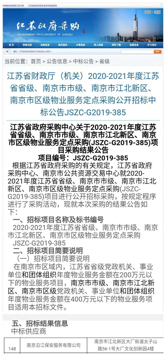 “南京沿江保安服務(wù)有限公司”憑借多年的積累和全體員工的辛苦付出、不懈努力,在本次招標活動中正式成為2020-2021年度江蘇省省級、南京市市級、南京市江北新區(qū)、南京市區(qū)級物業(yè)服務(wù)定點采購指定單位。