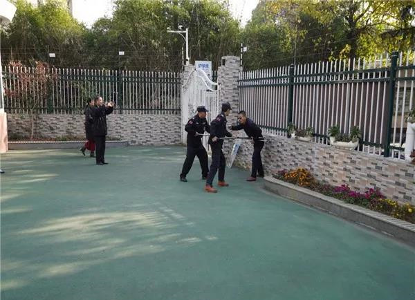 演練開始,一對中年夫婦以看望孫子為名要進(jìn)入幼兒園,保安進(jìn)行正常詢問,兩人言辭含糊不予配合,期間中年男子乘機(jī)闖入幼兒園,一名保安控制住中年婦女,另外兩名名保安迅速用防暴叉控制男子,男子拿出兇器,保安通知老師報(bào)警和保護(hù)孩子撤離。
