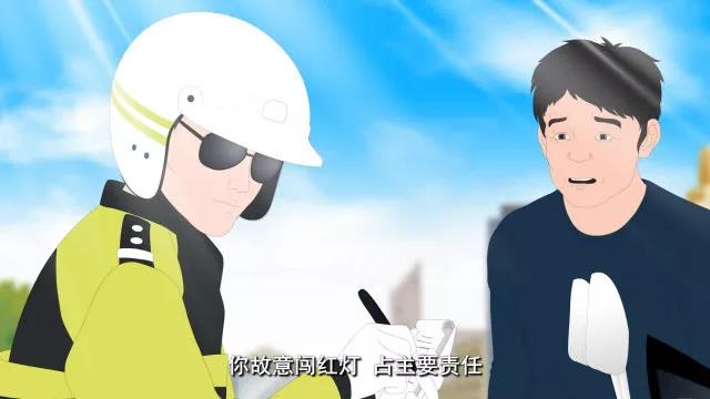 騎著摩托車的交警過來處理事故。交警對(duì)坐在地上的小強(qiáng)說:“你故意闖紅燈,要承擔(dān)本起事故的主要責(zé)任。”對(duì)轎車車主說:“你經(jīng)過路口車速?zèng)]有放緩,要承擔(dān)次要責(zé)任!”
